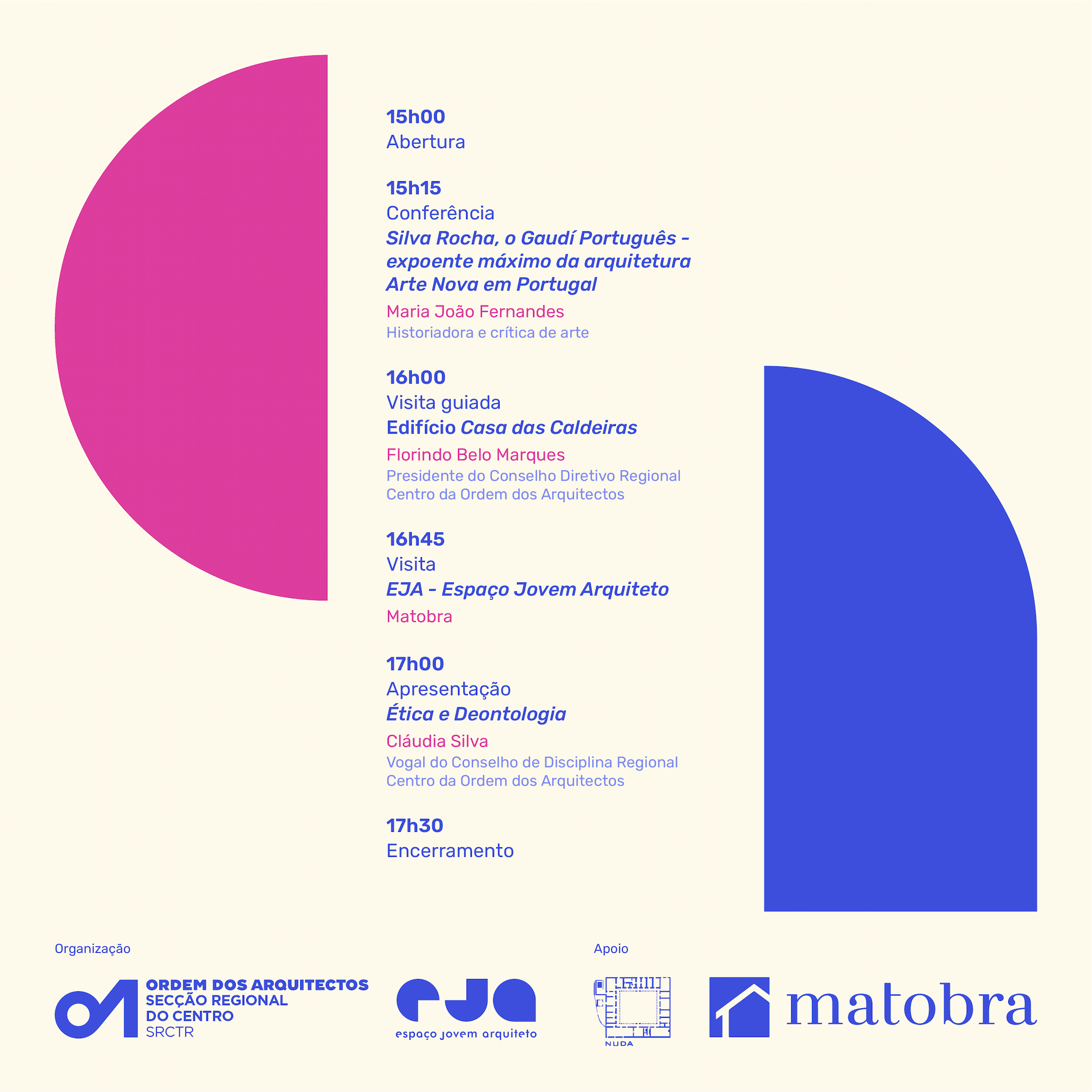 O programa do evento incluiu: uma conferência da historiadora e crítica de arte Maria João Fernandes, intitulada «Silva Rocha, o Gaudí Português - expoente máximo da arquitetura Arte Nova em Portugal»; uma visita guiada ao edifício da Casa das Caldeiras, conduzida pelo arquiteto Florindo Belo Marques, Presidente do Conselho Diretivo Regional Centro; uma visita ao espaço «EJA - Espaço Jovem Arquiteto»; e uma breve sessão sobre «Ética e Deontologia», apresentada pela arquiteta Cláudia Silva, vogal do Conselho de Disciplina Regional.