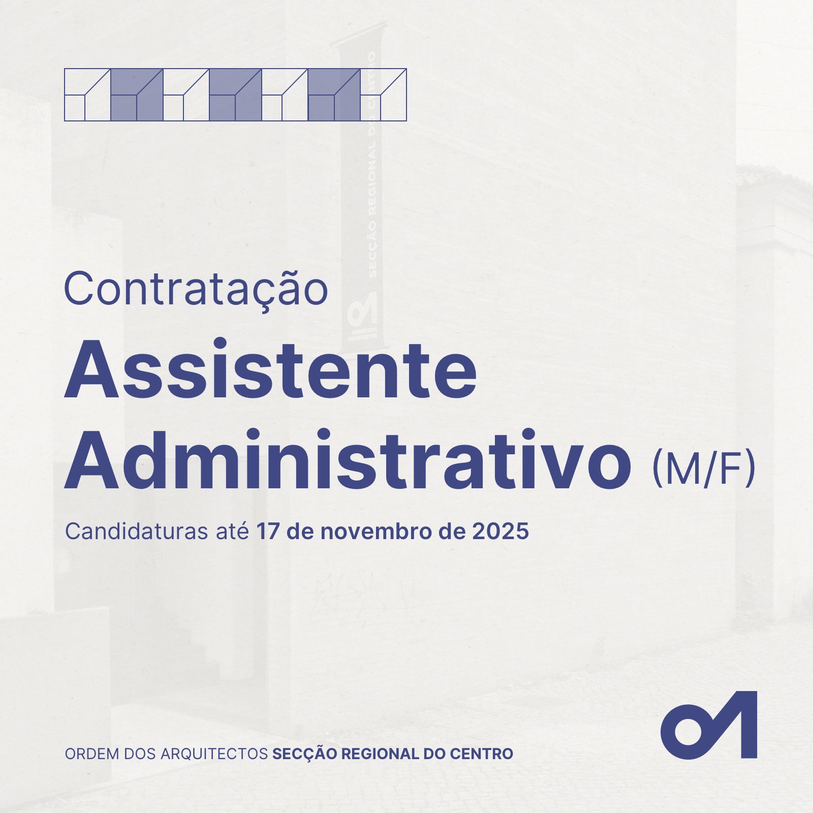 A Secção Regional do Centro da Ordem dos Arquitectos pretende contratar um Assistente Administrativo (m/f), em regime de contrato de trabalho a termo resolutivo certo, por um período de 12 meses, para exercer funções de apoio administrativo e de secretariado aos respetivos órgãos sociais.