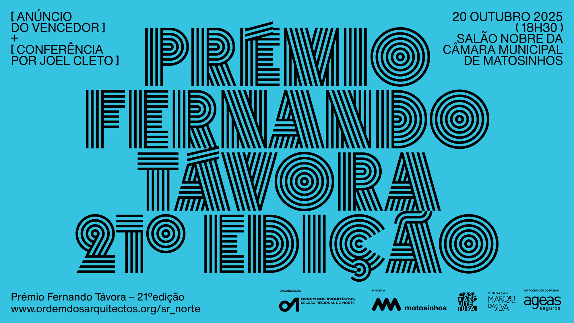 Início > Agenda > Prémio Fernando Távora 21ª edição | Cerimónia de Anúncio do Vencedor e Conferência por Joel Cleto A Secção Regional Norte da Ordem dos Arquitetos convida à presença na Cerimónia de Anúncio do Vencedor da 21ª edição do Prémio Fernando Távora, que decorre no dia 20 de Outubro, segunda-feira, pelas 18h30, no Salão Nobre da Câmara Municipal de Matosinhos.