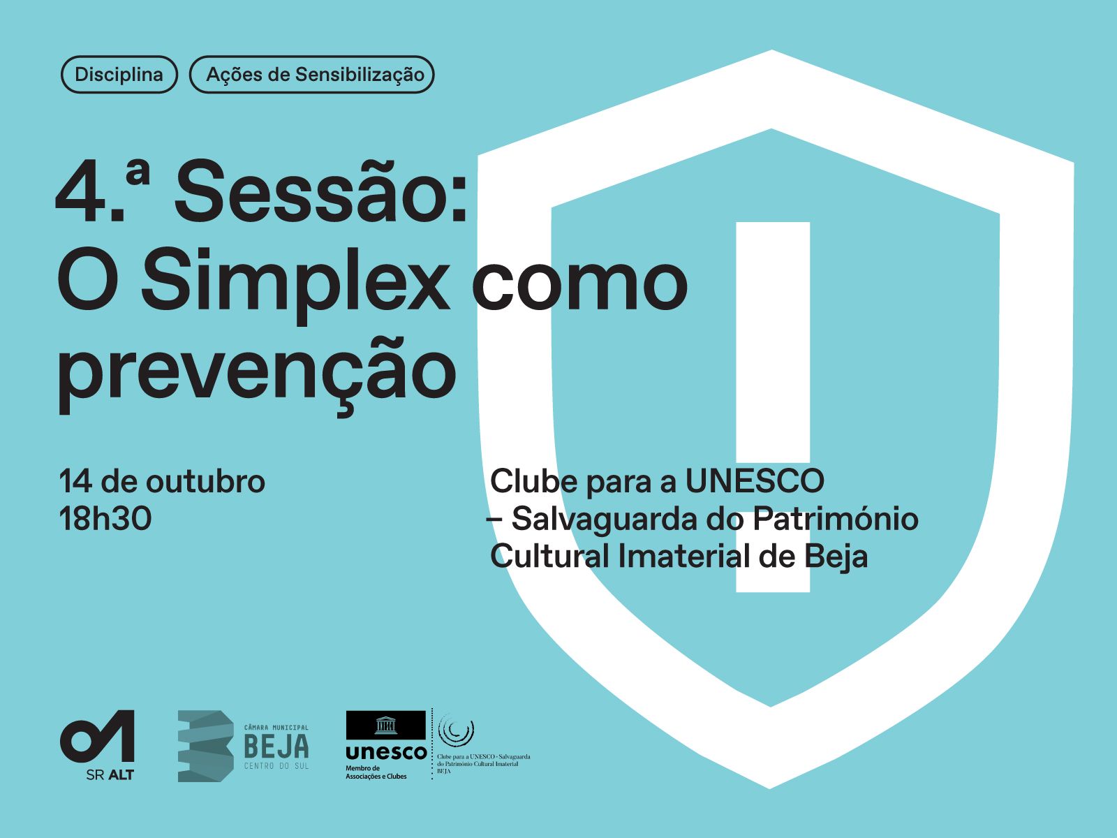 A Sessão #04 – O Simplex como Prevenção, terá lugar no próximo dia 14 de outubro, pelas 18h30, no Clube para a UNESCO - Salvaguarda do Património Cultural Imaterial de Beja.