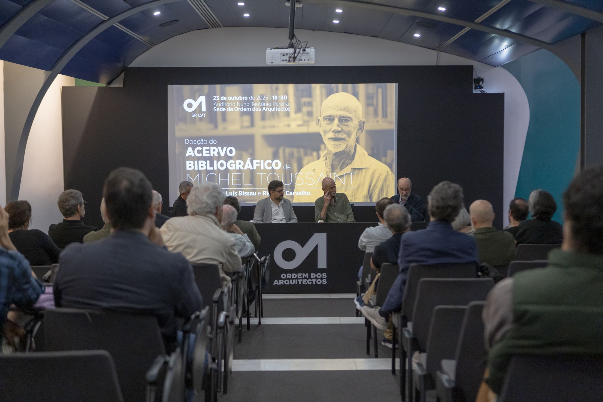 Num auditório repleto, os arquitetos Michel Toussaint, Luís Bissau e Ricardo Carvalho partilharam reflexões sobre a importância da investigação, da preservação da memória e da transmissão de conhecimento entre gerações.