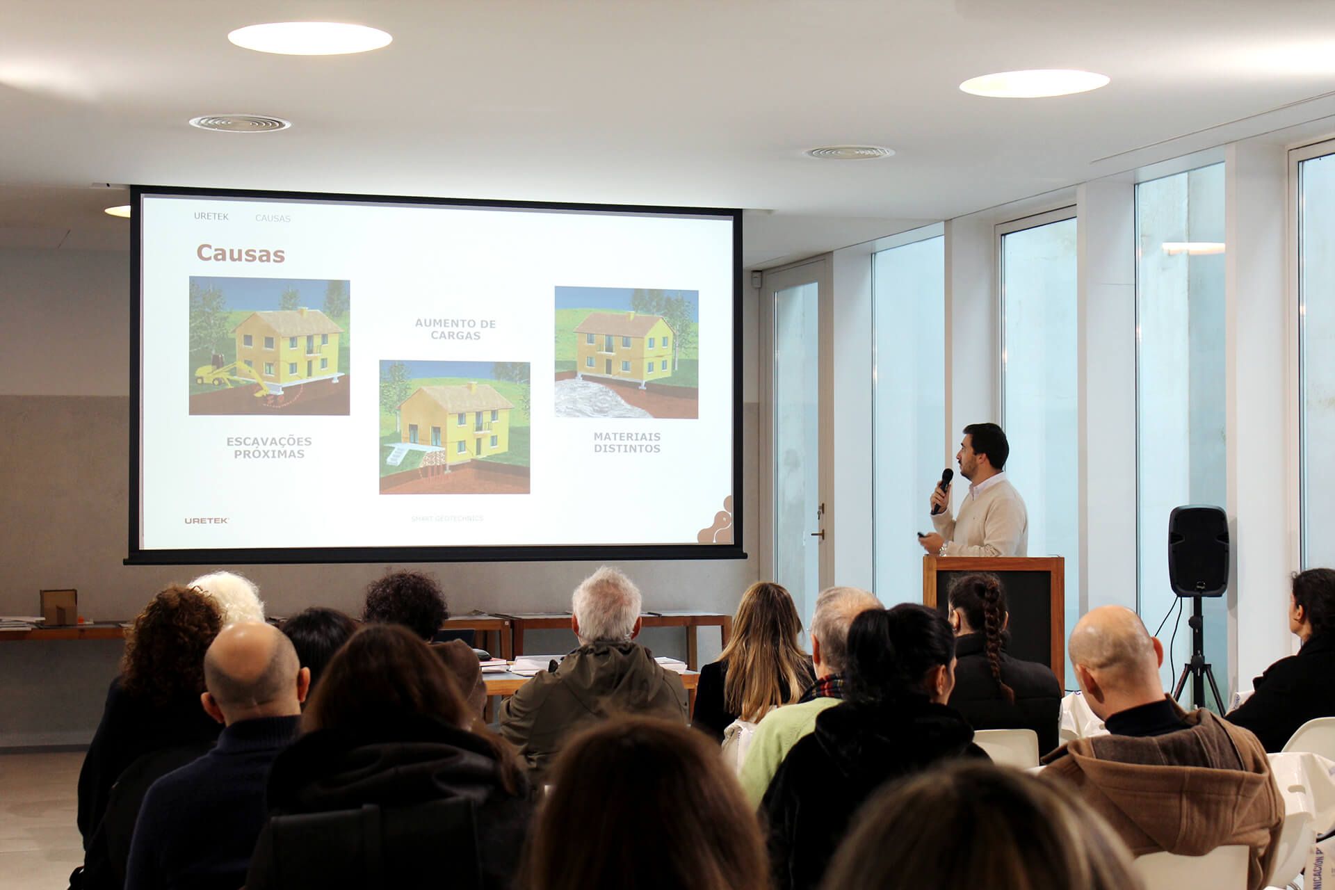 Seguiu-se a sessão dedicada às soluções para restauração de estruturas com injeções de resina, conduzida por Ricardo Val de Ovelha, Sales Manager da Uretek, bem como a apresentação sobre construção industrializada e Passivhaus, a cargo de Celso Almeida, Gestor de Exportação da Multipanel. Após a pausa para café, Cristina Alonso, responsável de Desenvolvimento de Produto da ITTE, apresentou o sistema de reforço ITTE para cargas em divisórias ligeiras. A temática da impermeabilização esteve em destaque na comunicação “Membranas técnicas de impermeabilização: a chave para evitar fugas antes que seja tarde demais”, apresentada por Salvador Silva, Area Manager Portugal da Estil Guru, e Alberto Espina, da mesma empresa. Durante a tarde, Miguel Ángel Leite, diretor da Agência Noroeste para Espanha e Portugal da Murprotec, abordou a humidade estrutural, as suas causas, consequências e tratamentos definitivos, encerrando o ciclo de apresentações Adolfo Fernández, delegado comercial da Fakro Galicia e Portugal, com a sessão dedicada à otimização de invólucros, soluções construtivas e Passive House.